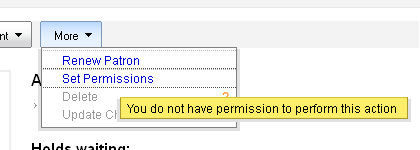 Created attachment 22195 [details] [review] Bug 2310 - Delete grayed out w/out explanation With some staff client menus options are displayed as disabled when the logged in user doesn't have permission to perform that function. This patch adds Bootstrap tooltips to patron menu items with text explaining why they are disabled. To test, log in as a user who lacks permission to modify patrons or set permissions. Open a patron record in circulation or patrons. Hovering over renew, delete, and set permissions links (in the patron toolbar "More" menu) should trigger a tooltip with a brief explanation. Test the "Update child to adult patron" link by viewing an adult patron. A separate patch will address catalog menu items.