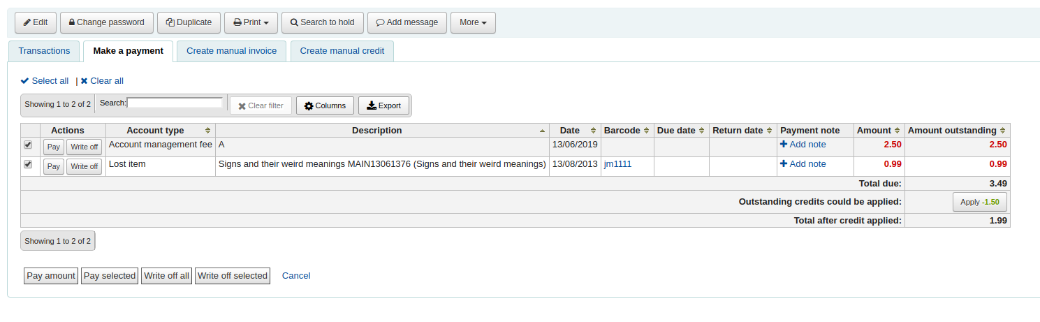 Created attachment 90625 [details] [review] Bug 23106: Tweak display of totals on payment page This patch tweaks the display of totals on the fines payments page to clarify between the totals before and after applying credits. Test Plan: 1) Add some debts and credits to a patrons account 2) Look at the pay page before applying the patch 3) Look at the pay page after applying the patch 4) Verify the new layout is an improvment or not Signed-off-by: Martin Renvoize <martin.renvoize@ptfs-europe.com> Signed-off-by: Owen Leonard <oleonard@myacpl.org> Signed-off-by: Maryse Simard <maryse.simard@inlibro.com> Signed-off-by: Nick Clemens <nick@bywatersolutions.com>