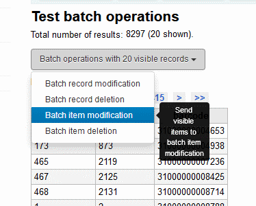 Created attachment 91376 [details] [review] Bug 23197: Add more batch operation options to SQL report results This patch extends the feature which allows the user to send item numbers from a page of report results to batch item modification. For biblionumbers: Batch record modification, batch record deletion, and add to list are now available. For item numbers: batch item deletion is added. A new menu button is added for these options at the top of report results, removing the button from the item number column header. Corresponding CSS has been removed. To test, apply the patch and create a report which includes both biblionumber and itemnumber columns in the results. - Run the report and confirm that a new "Batch operations" button appears at the top of the results. Test each option: - Batch record modification - Batch record deletion - Add to list - Batch item modification - Batch item deletion In each case the correct set of parameters should be passed to the batch operations. Test with reports which return only biblionumbers, only itemnumbers, and neither. Signed-off-by: Maryse Simard <maryse.simard@inlibro.com>