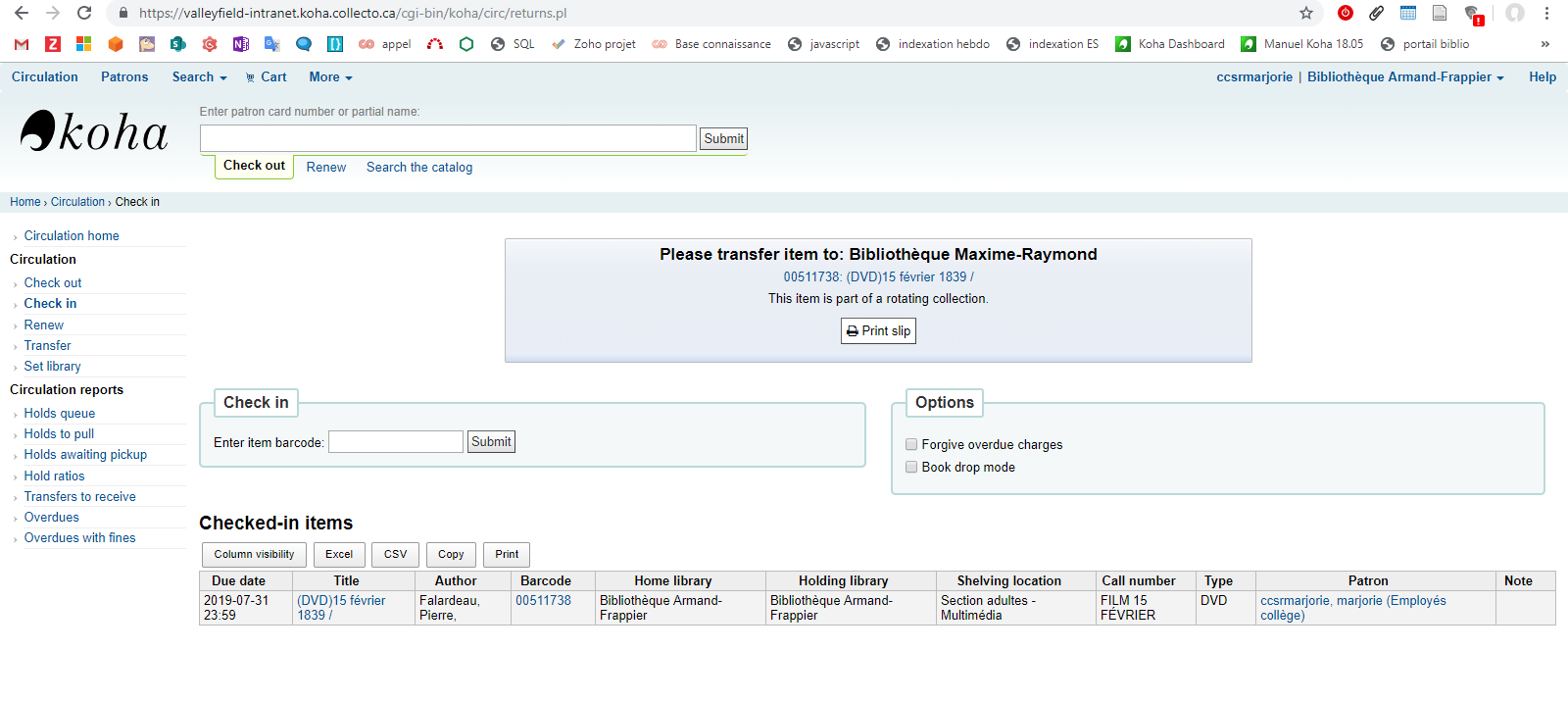 Created attachment 91742 [details] dialog box transfert Hi, The transfert status is missing when a return is made on an item belonging to a rotating collection. Test plan: - Put an item on a rotating collection - check out item -Set branch to a different branch - check in item - alert message is displayed "Please transfert item to holding branch Y. This item is part of a rotating collection". There is not the usual question that appears when a return is made on a document to be transferred. - in detail page of biblio, status is available, item is not in transfert status like "in transit from homebranch to holding branch". Regards Marjorie