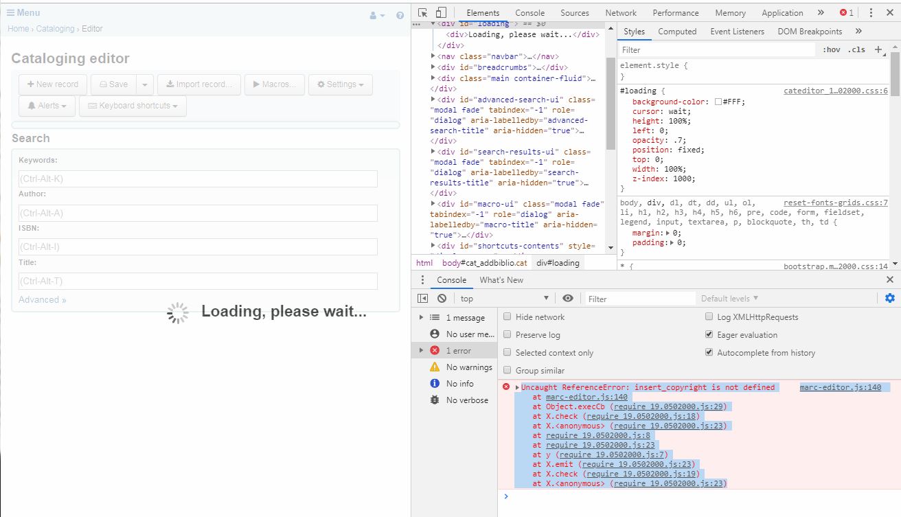 Created attachment 91854 [details] Screenshot from Chrome The Advanced Editor fails to load on 19.05 with the error message: marc-editor.js:140 Uncaught ReferenceError: insert_copyright is not defined at marc-editor.js:140 at Object.execCb (require_19.0502000.js:29) at X.check (require_19.0502000.js:18) at X.<anonymous> (require_19.0502000.js:23) at require_19.0502000.js:8 at require_19.0502000.js:23 at y (require_19.0502000.js:7) at X.emit (require_19.0502000.js:23) at X.check (require_19.0502000.js:19) at X.<anonymous> (require_19.0502000.js:23) used Chrome and Firefox.