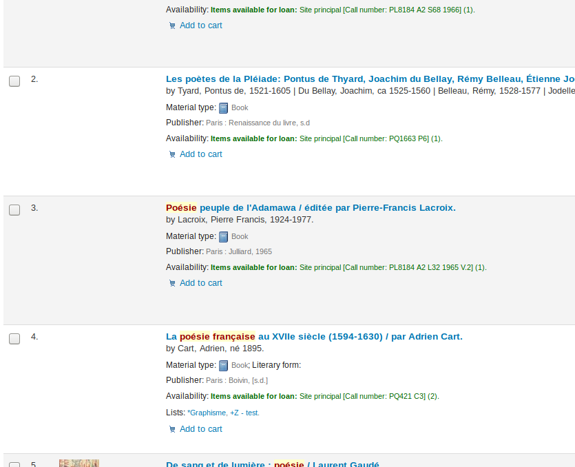 Hi, Records suppressed with OpacSuppression are always displayed in search result with ElasticSearch. If I try to consult the record in detailed view, the blocking message appears however. I read here https://bugs.koha-community.org/bugzilla3/show_bug.cgi?id=16660#c1 : NB: OPAC suppression is not implemented for Elasticsearch Anyone work on it? Regards, Marjorie