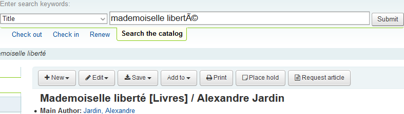 Hi Marcel, I know I used a Biblibre's sandbox in Unimarc, but I can't remember if it was http://pro.es5-koha.sandbox.biblibre.eu (login with test/test) which uses ES5 or http://pro.es6-koha.sandbox.biblibre.eu with ES6. I tried with several title and everything worked fine, except for the title "Mademoiselle liberté" with this little issue. This is something quite usual with some letter with diacritics in French (see for example bug 23542), so as I said, I'm not sure it comes from the patch, nor if the patch could solve this problem.