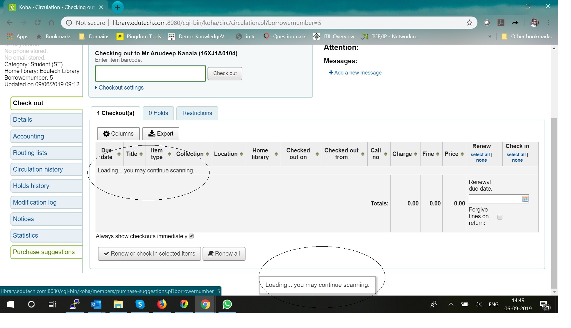 Created attachment 92617 [details] issue in checkout update hi, when checkout items using SIP2, the same is not getting updated in to patron's account. it is just showing loading and not load at all. please find the attached screenshot and help me resolving this issue i have tried updating system status to 'YES" in SIP config file and also tried the below steps also but negative result. Access your Koha server with shell. - Locate the file 'checkouts' in your local Koha installation. It is in 'svc' subdirectory of the Koha home directory. - Change your working directory to the directory containing 'checkouts'. - Run this command: wget -O checkouts http://tinyurl.com/zg6ukte It retrieves a valid 'checkouts' program. Nidheesh Madhavan