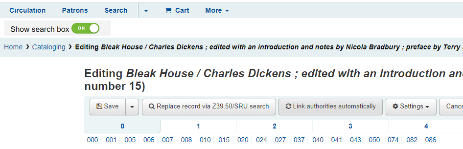 In the Advanced Cataloging editor, both addbooks.pl and additem.pl have a cataloging search box at the top of the page. It would be great to add one to cataloguing/editor.pl so that users don’t have to click away from the page if they need to perform a new search.