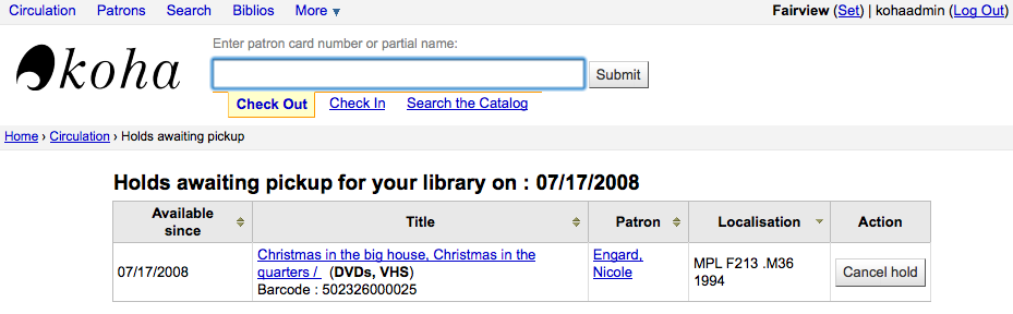 ---- Reported by nengard@gmail.com 2008-07-17 10:51:33 ---- At the top of the 'Holds awaiting pickup' report it says: "Holds awaiting pickup for your library on : 07/17/2008" but the report shows all items awaiting pickup for every branch and doesn't tell me what branch the item is waiting at. Shouldn't this report be limited to the branch I'm logged in at? ---- Additional Comments From nengard@gmail.com 2008-07-17 10:51:52 ---- Created an attachment same hold at 2 branches ---- Additional Comments From nengard@gmail.com 2008-07-17 10:52:10 ---- Created an attachment same hold at 2 branches ---- Additional Comments From nengard@gmail.com 2008-07-17 10:53:50 ---- In the two screenshots you'll see that i'm logged in at 2 diff branches - and this particular hold is waiting at Midway - not either of the branches I logged in as. ---- Additional Comments From jmf@liblime.com 2008-08-08 13:54:59 ---- pushing to 3.2 ---- Additional Comments From nengard@gmail.com 2009-12-21 13:16:56 ---- I have tested on the most recent version of HEAD and this is still an issue. ---- Additional Comments From chris@bigballofwax.co.nz 2010-02-25 21:06:17 ---- Created an attachment Patch --- Bug imported by chris@bigballofwax.co.nz 2010-05-21 00:50 UTC --- This bug was previously known as _bug_ 2367 at http://bugs.koha.org/cgi-bin/bugzilla3/show_bug.cgi?id=2367 Imported an attachment (id=642) Imported an attachment (id=643) Imported an attachment (id=644) Actual time not defined. Setting to 0.0 CC member arm@hanover.ca does not have an account here CC member bchurch@ptfs.com does not have an account here The original submitter of attachment 642 [details] is unknown. Reassigning to the person who moved it here: chris@bigballofwax.co.nz. The original submitter of attachment 643 [details] is unknown. Reassigning to the person who moved it here: chris@bigballofwax.co.nz. The original submitter of attachment 644 [details] [review] is unknown. Reassigning to the person who moved it here: chris@bigballofwax.co.nz.