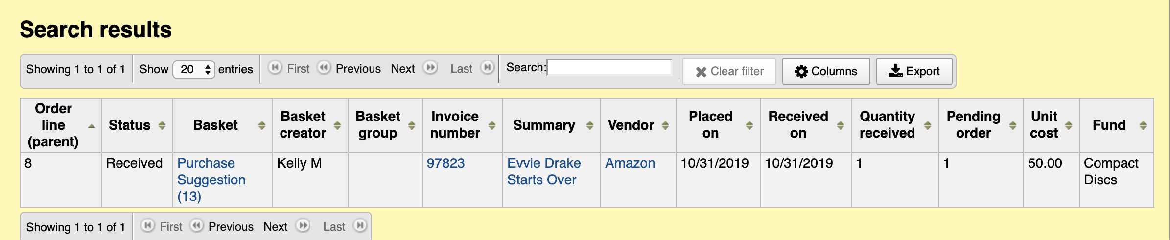 Created attachment 94927 [details] search With the introduction of bug 21308, the library can search the acquisitions module for a title, order, etc. With this first acquisition search, the results will populate and all the search filters appear on the left-hand side of the screen. If the search started in the standard acquisitions search -see screenshot- then the clear filter does not work when the results are populated. The only way to clear this search is to search for something else using the left hand search boxes.