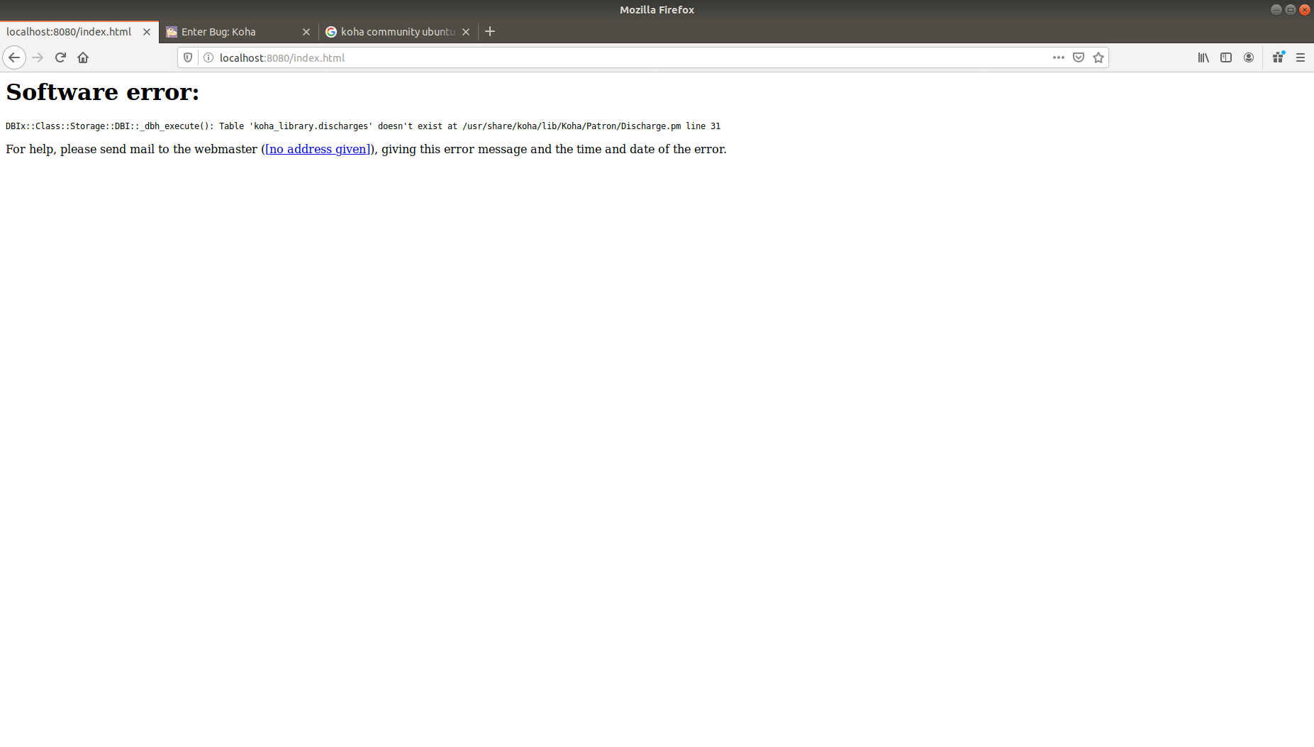 Created attachment 95245 [details] Error Page Dear all Greetings! I am a new Koha user establishing library system for a non-profit postgraduate educational institution. Nice to meet all developers and thank you for making Koha freely accessible to all globally. Just now I have installed Koha 19.05 on Ubuntu using Ubuntu 18.04.3 LTS terminal, following all the steps in the webinstaller. I attempted logging in using the newly created administrator password. An error message popped up in the subsequent screen: ______________________________________________________________________ Software error: DBIx::Class::Storage::DBI::_dbh_execute(): Table 'koha_library.discharges' doesn't exist at /usr/share/koha/lib/Koha/Patron/Discharge.pm line 31 For help, please send mail to the webmaster ([no address given]), giving this error message and the time and date of the error. ______________________________________________________________________ Attached is the error screen for your reference. For your information, the MySQL on the Ubuntu 18.04.3 LTS downloaded through Ubuntu terminal using "sudo apt-get mysql-server". Also during installation, I followed all the steps as mentioned on https://wiki.koha-community.org/wiki/Koha_on_ubuntu_-_packages. The patron categories and administrator account were already set up during the webinstall stage. Could anyone give some pointers ahead? Most grateful for all your professional advice! Best Andrew