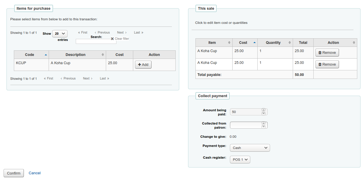 This enhancement adds a new 'library details' page to the POS system which displays a summary of the cash register transactions for a library since each register was last cashed up. It also allows for cashing up individual registers or cashing up all registers at a given library in one transaction.