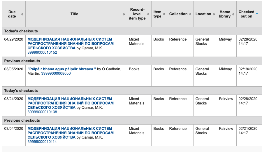 When checkouts were grouped into “Today’s checkouts” and “Previous checkouts,” sorting by a column (like title or branch) would break the grouping and show everything in one long list.