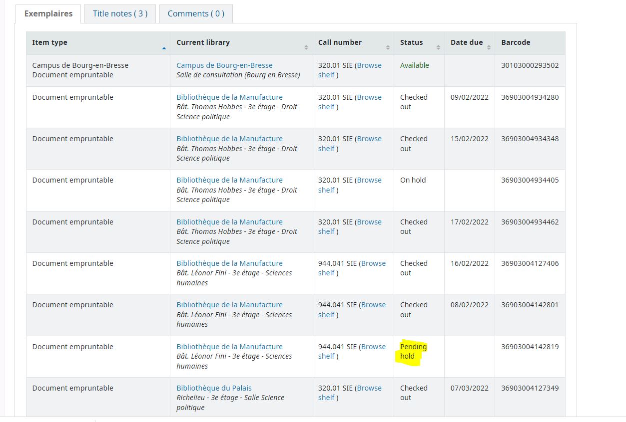 (In reply to Koha Team University Lyon 3 from comment #3) > Actually, we have in our OPAC a status "pending hold" in a 20.11.09 koha > version, but, we don't want to :-( > In our library, we want that holds concerned only books already on loan. We > left items on shelves for students that prefer to go and see through the > library. > > In the circulation rules, we have "on shelf holds allowed = If any > unavailable" and we don't allow OPAC item level holds. It means for us that > if one item is borrowed, it is possible to put an hold on the biblio level, > but the hold will be filled only if an item is returned. > > I'm a bit confused because I tried several possibilities for > OPACShowHoldQueueDetails but it didn't change anything :-( Could this have been an item level hold placed from the staff side? As only one item shows the status, it looks like it must be item level - at least that is what I would check first.