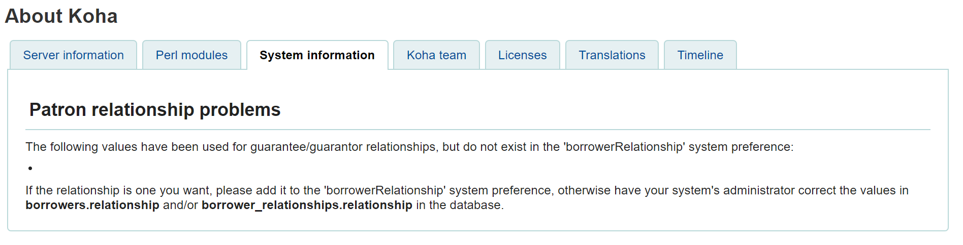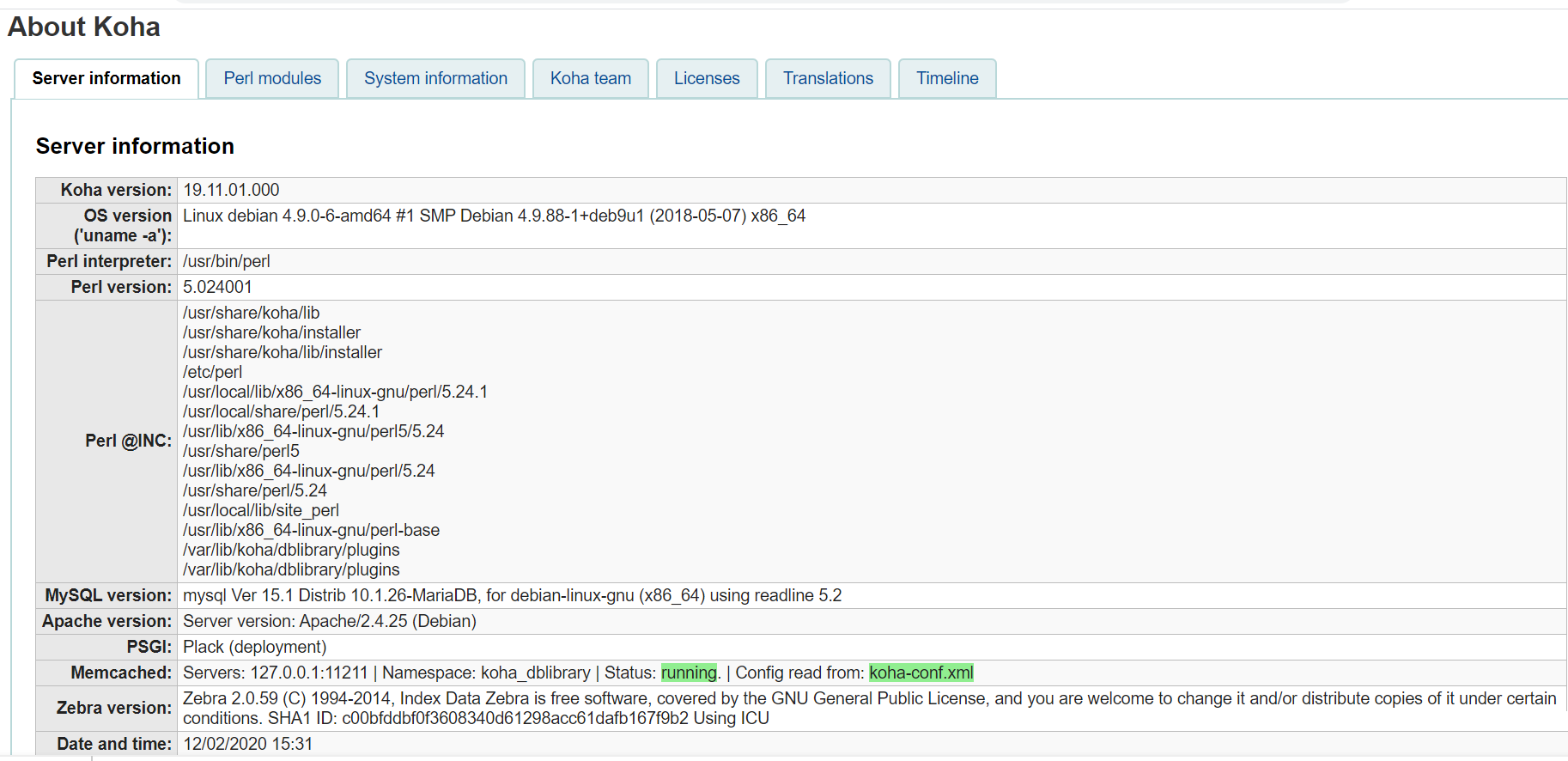 for use_zebra_facets it is 1 / <use_zebra_facets>1</use_zebra_facets> zebra_max_record_size is missing in my config file (koha-conf.xml) ! should I add it with the default value 1024 or i will increase is to 2 MB (<zebra_max_record_size>2048</zebra_max_record_size>) this adjustment requires only to restart Zebra, there is no need to do a full re-index ? right ? concerning "Koha about page", every thing is normal (please check the attached screenshots) PSGI: Plack (deployment) Memcached: Servers: 127.0.0.1:11211 | Namespace: koha_dblibrary | Status: running. | Config read from: koha-conf.xml in system information tab, there is the below warning related to "Patron relationship problems", this warning has appeared after the upgrade from 18.11 to 19.11. we have ignored it since we are not using borrower relationships. Patron relationship problems The following values have been used for guarantee/guarantor relationships, but do not exist in the 'borrowerRelationship' system preference: If the relationship is one you want, please add it to the 'borrowerRelationship' system preference, otherwise have your system's administrator correct the values in borrowers.relationship and/or borrower_relationships.relationship in the database.
