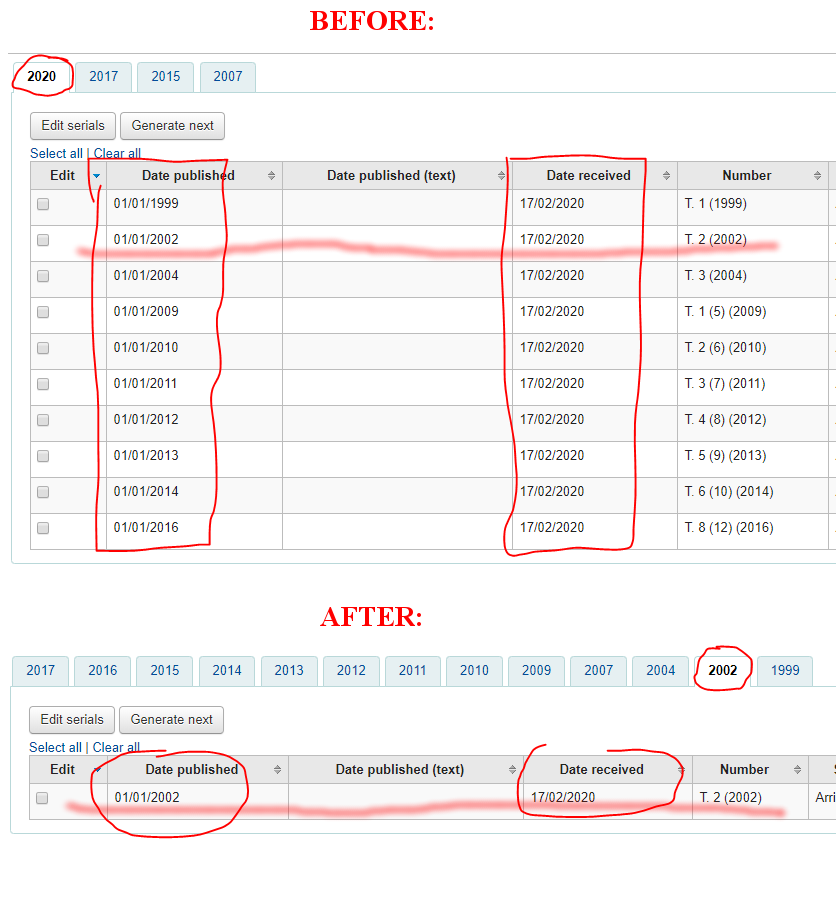 Created attachment 99187 [details] Test case Test plan: - receive some back issues (of past years) - see that they are aggregated under current year (i.e. 2020) - apply the patch - check that the attribution of volumes/issues to years is OK now