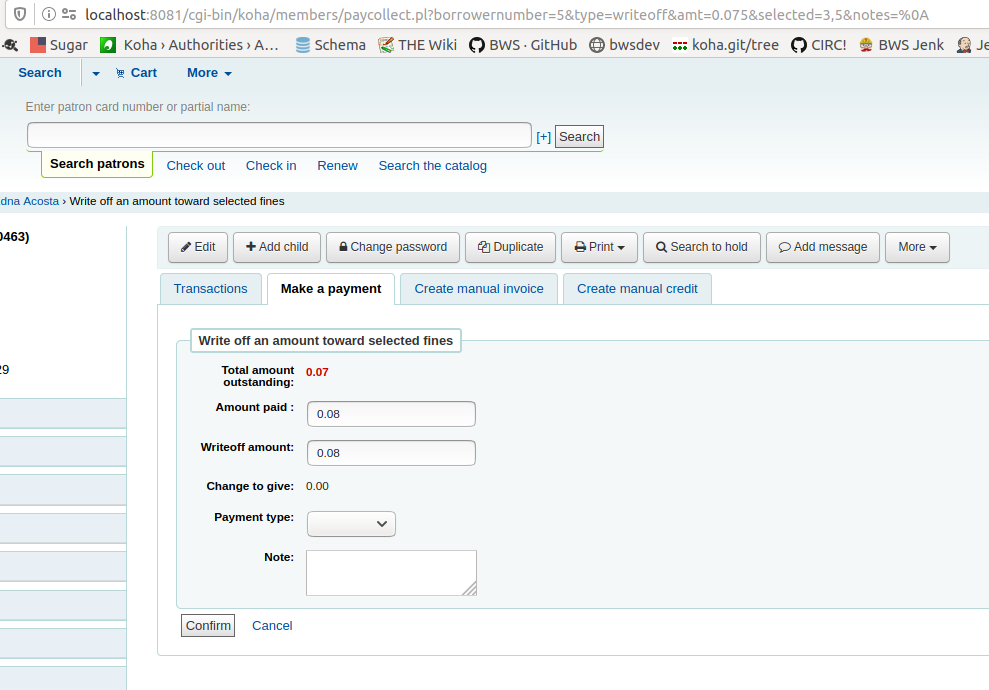 Created attachment 100956 [details] Screenshot of writeoff selected view If you create some fines and click 'writeoff selected' and you have payment types defined in your system they show on this screen, but are not really relevant to a writeoff. Change options are also available with 'Writeoff amount' which again does not make sense as a write off does not involve collecting money