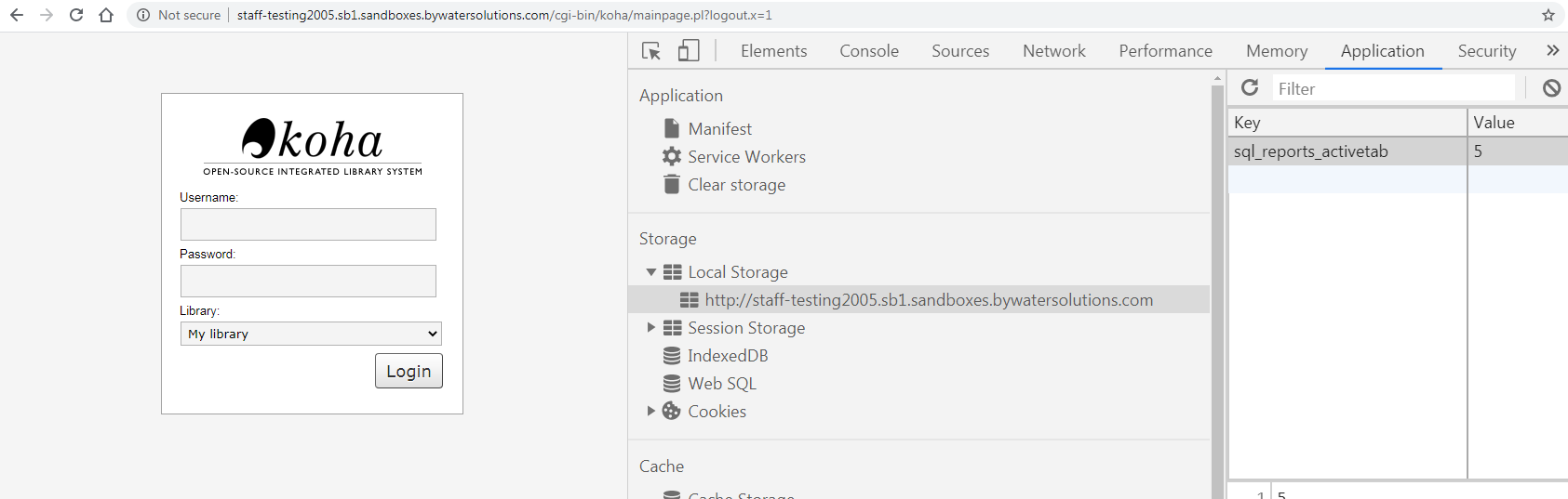 Hi Owen, This was baffling me too. As you couldn't replicate it, I had another test to see if I could help: The value in localStorage still persisted with the ordinary tests. I noticed you were using a different account, so on the off chance, I created a new superlibrarian instead of using the koha default log in, but the value still persisted. I then looked at the Diff on the bug, and ran the JS command from the console: $(localStorage.removeItem("sql_reports_activetab")); This removed the storage element, so it verified that the JS you've used was correct and there's nothing awry with the browsers I'm using. I noticed that the command is next to the clearHoldFor() function in the JS file, so I tested to see if the clear hold function still worked, and sure enough: - Load patron - Use 'search to hold' function - Log out - Log back in - Load record - Place hold button still recalls the patron from step 1 So the JS command is correct, but perhaps the placement in the file has broken the functionality? Hope that helps :)