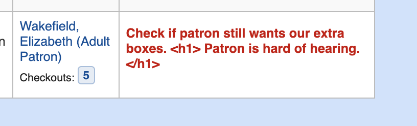 Created attachment 148387 [details] [review] Bug 25379: Add raw filter to circulation note on checkin page This is a consistency patch: we already allow adding HTML tags to the patron circulation note and the contents display correctly in the patron account and in the patron search results in the staff interface. But the HTML tags are printed on the checkins page. To test: * Add a circulation note including HTML tags to a patron Example: <h1>This patron is great!</h1> * Check an item out to this patron * Verify that the note displays formatted in patron search results * Verify that the note displays formatted in the patron record * Return the item * Verify the note shows the printed tags * Apply patch * Check item out again and check it in again * Verify the note now displays correctly in list of checkins
