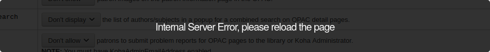 Created attachment 105506 [details] screenshot showing the error message Ok, so I don't know if this should be a bug. Tomás said to file one anyway. :) It does impact my ability to do pretty much anything with my Koha install. I have a git install of Koha which I update using git pull/updatedatabase. No plack, no memcached. For a couple of weeks, I haven't been able to change system preferences. When I try to save, it says "Internal Server Error, please reload the page". This is not the blank Internal Server Error you get when you have plack. It's a message that pops-up in a dark grey box (see attachment).