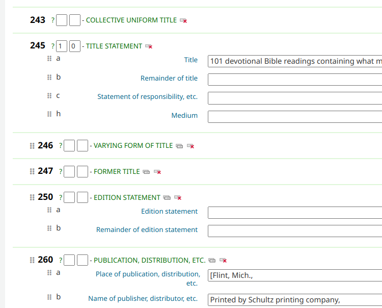 Created attachment 167973 [details] Inconsistent move icons While looking at a record, I could see move icons on some fields and not others. With the 2XX fields, clicking on the move icon to move a field fails. The move icons seem to indicate the fields can be reordered, but they actually can't. Should these fields be reorderable? It makes sense for the subfields to be reorderable on certain tags, but I'm not sure about the primary fields.