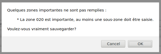 Created attachment 106522 [details] Alert box in French (CA) where the Cancel button is not translated I noticed when you try to save a record where an important field is not filled, the Cancel (and probably the OK) button is not translatable. I tried to find the string in my staff-prog.po file and couldn't find it. To get the alert: 1- Modify a framework and mark one of the fields as important 2- Open a new record in cataloging and fill out the mandatory fields but not the important field 3- Try to save the record There is a "Cancel" string and a "Cancel " string in staff-prog.po, but they only apply on the following lines, which is not the important alert as far as I can tell. #: intranet-tmpl/prog/en/modules/cataloguing/addbiblio.tt:632 #: intranet-tmpl/prog/en/modules/cataloguing/addbiblio.tt:636 #: intranet-tmpl/prog/en/modules/cataloguing/addbiblio.tt:640 #: intranet-tmpl/prog/en/modules/cataloguing/addbiblio.tt:644 #: intranet-tmpl/prog/en/modules/cataloguing/addbiblio.tt:648