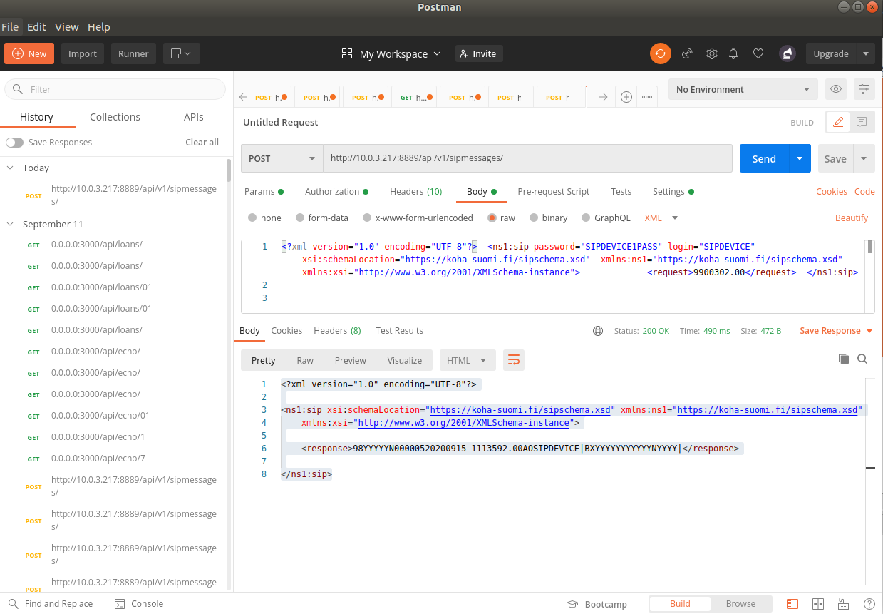 Here a quick how-to: For this module to work you obviously need to apply the patch. Then there's a configuration file called sip2ohttp-conf.xml attached that needs to be put into the same configuration file folder as the environment variable KOHA_CONF points to (where koha-conf.xml file is located). The xml validation requires an xml schema file (sipschema.xml). The schema file should be located in the koha-tmpl folder (the parent directory of koha-tmpl folder gets read like this: C4::Context->config('intranetdir');) When the REST endpoint receives an XML message, it will be validated against this schema file before further processing. In the configuration file sip2ohttp-conf.xml there's a short description on how to use it. You need to add the devices that you want to use sipohttps with here. The module SIPoHTTP.pm will search for device parameters from here when the REST endpoint /sipmessages receives a POST request with an XML in the request body. example config parameters for a device login with an ID "SIPDEVICE" (also configured in SIPdevices.xml by the same ID): <SIPDEVICENAME> <host>127.0.0.1</host> <port>6009</port> </SIPDEVICENAME> Host and port are the sip server's address you want the device to talk with. Obviously you need a sip server running in that address. As mentioned, the device should also be configured to be able to use the sip servers in the SIPconfig.xml file. The device login id's configured in the sip2ohttp-conf.xml file need to match the login id's defined in SIPconfig.xml. That's about it. Now you can communicate with the sip server/servers via the REST endpoint by passing it an XML file like in the Postman attachment I included.