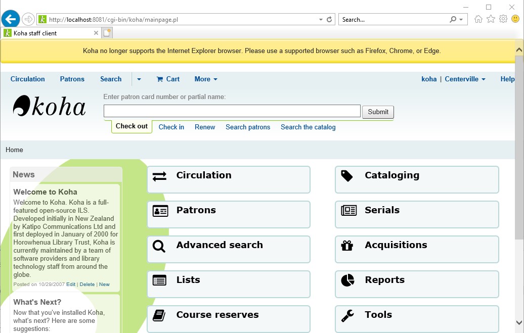 I frequently get people raising issues about Koha not working because they're using Internet Explorer. While I think it is very sensible for Koha not to support IE, I think it might be useful in this transitional time to show a warning banner on the Staff Interface to tell users that they can't use IE anymore and expect Koha to work.