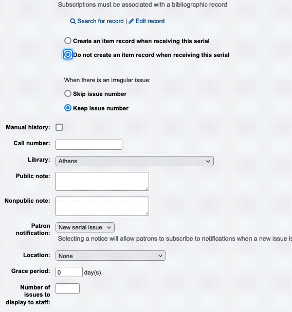 On the first screen of subscription-add.pl, there are several fields that set values to be applied to created items. They're only needed if you are creating item records when receiving serials. It'd be very helpful to move these so that they are all grouped together and clearly labeled. It might even be reasonable to hide them if not set to create item records. These fields relate to the item record: - Call number - Library - Location - item type - item type for older issues