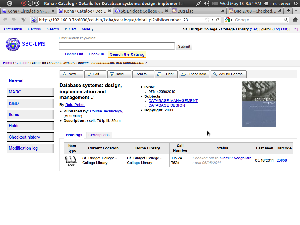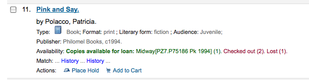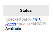 ---- Reported by nengard@gmail.com 2008-10-22 02:48:45 ---- In the attached screenshots you'll see that some items which are very obviously checked out are also saying that they're available. It's not every item though - just sometimes. I'm including screenshots from two different OPACs. ---- Additional Comments From nengard@gmail.com 2008-10-22 02:49:07 ---- Created an attachment some avail - some not ---- Additional Comments From nengard@gmail.com 2008-10-22 02:49:25 ---- Created an attachment another example ---- Additional Comments From nengard@gmail.com 2008-10-22 02:55:31 ---- Some examples from Joe: mysql> select biblio.title, biblio.author, items.* from items LEFT JOIN biblio on (biblio.biblionumber=items.biblionumber) where barcode="55500000000381"; +---------------------------+-------------------+------------+--------------+------------------+----------------+-----------------+--------------+------------+-------+------------------+----------------------+------------------+--------------+-------+------------+---------+----------+----------+----------------+--------+----------+----------+------------+-----------+---------------+---------+---------------------+----------+--------+-----------+---------+-------+-----------+------+----------+--------------------+-----------+------------+ | title | author | itemnumber | biblionumber | biblioitemnumber | barcode | dateaccessioned | booksellerid | homebranch | price | replacementprice | replacementpricedate | datelastborrowed | datelastseen | stack | notforloan | damaged | itemlost | wthdrawn | itemcallnumber | issues | renewals | reserves | restricted | itemnotes | holdingbranch | paidfor | timestamp | location | onloan | cn_source | cn_sort | ccode | materials | uri | itype | more_subfields_xml | enumchron | copynumber | +---------------------------+-------------------+------------+--------------+------------------+----------------+-----------------+--------------+------------+-------+------------------+----------------------+------------------+--------------+-------+------------+---------+----------+----------+----------------+--------+----------+----------+------------+-----------+---------------+---------+---------------------+----------+--------+-----------+---------+-------+-----------+------+----------+--------------------+-----------+------------+ | Organizational behavior : | Nelson, Debra L., | 25412 | 19163 | 19163 | 55500000000381 | 2007-06-10 | NULL | TXT | NULL | NULL | 2008-06-10 | NULL | 2008-09-02 | NULL | 0 | 0 | 0 | 0 | BUS 350 | NULL | NULL | NULL | NULL | NULL | NULL | NULL | 2008-09-02 09:20:25 | NULL | NULL | NULL | BUS_350 | TXT | NULL | NULL | TEXTBOOK | NULL | NULL | NULL | +---------------------------+-------------------+------------+--------------+------------------+----------------+-----------------+--------------+------------+-------+------------------+----------------------+------------------+--------------+-------+------------+---------+----------+----------+----------------+--------+----------+----------+------------+-----------+---------------+---------+---------------------+----------+--------+-----------+---------+-------+-----------+------+----------+--------------------+-----------+------------+ 1 row in set (0.00 sec) mysql> select ccode,count(*) from items WHERE biblionumber=19163 GROUP BY ccode ; +-------+----------+ | ccode | count(*) | +-------+----------+ | RES | 1 | | T | 2 | | TXT | 51 | +-------+----------+ 3 rows in set (0.00 sec) mysql> select homebranch,count(*) from items WHERE biblionumber=19163 GROUP BY homebranch ; +------------+----------+ | homebranch | count(*) | +------------+----------+ | LCC | 1 | | TXT | 53 | +------------+----------+ 2 rows in set (0.00 sec) mysql> select location,count(*) from items WHERE biblionumber=19163 GROUP BY location ; +----------+----------+ | location | count(*) | +----------+----------+ | NULL | 54 | +----------+----------+ 1 row in set (0.00 sec) mysql> select itype,count(*) from items WHERE biblionumber=19163 GROUP BY itype ; +----------+----------+ | itype | count(*) | +----------+----------+ | R | 1 | | RH2 | 1 | | TEXTBOOK | 52 | +----------+----------+ 3 rows in set (0.00 sec) ---- Additional Comments From nengard@gmail.com 2008-11-10 10:13:21 ---- I have support tickets regarding this issue. Any ideas? ---- Additional Comments From jmf@liblime.com 2008-11-27 11:26:27 ---- There is not enough information here for me to determine: 1. which specific pages are displaying Available incorrectly (paths please) 2. what the purpose of the SQL in this report is ... what is that showing exactly? ---- Additional Comments From joe.atzberger@liblime.com 2008-11-27 11:45:28 ---- The attachments are clearly the staff search results and details page. ---- Additional Comments From kyle.m.hall@gmail.com 2008-12-05 09:35:30 ---- I've submitted a patch that ports my dev_week reserves enhancements to Koha 3. ---- Additional Comments From nengard@gmail.com 2009-02-13 08:12:09 ---- Created an attachment results show the right info ---- Additional Comments From nengard@gmail.com 2009-02-13 08:12:40 ---- Created an attachment detail page shows diff details than results ---- Additional Comments From joe.atzberger@liblime.com 2009-02-13 10:47:11 ---- The SQL Nicole included is only peripherally related. --- Bug imported by chris@bigballofwax.co.nz 2010-05-21 00:54 UTC --- This bug was previously known as _bug_ 2708 at http://bugs.koha.org/cgi-bin/bugzilla3/show_bug.cgi?id=2708 Imported an attachment (id=808) Imported an attachment (id=809) Imported an attachment (id=810) Imported an attachment (id=811) Actual time not defined. Setting to 0.0 CC member bchurch@ptfs.com does not have an account here CC member joe.atzberger@liblime.com does not have an account here The original submitter of attachment 808 [details] is unknown. Reassigning to the person who moved it here: chris@bigballofwax.co.nz. The original submitter of attachment 809 [details] is unknown. Reassigning