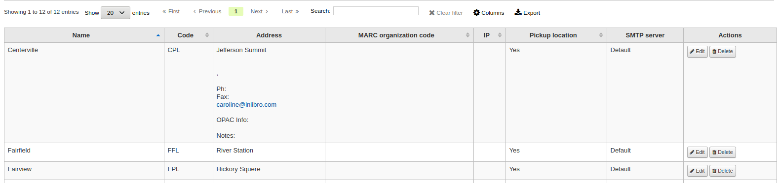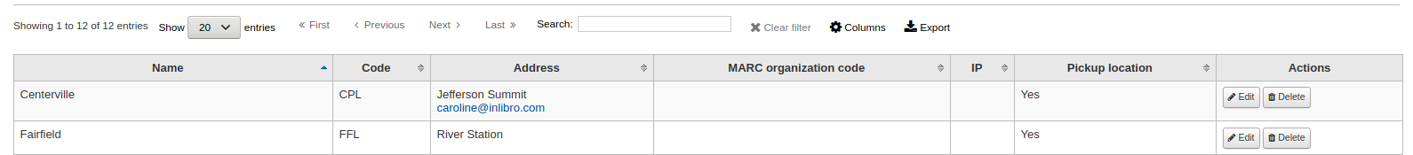 I added an email address to a library and it caused the display to display everything even if this particular library had no information. (Sorry, I can't find a way to explain it, see screen capture...) To replicate : 1- Go to Administration > Libraries 2- Edit a library 3- Enter an email address (the library name and address line 1 were already filled in my db) 4- Save 5- See table, it's all stretched with empty information