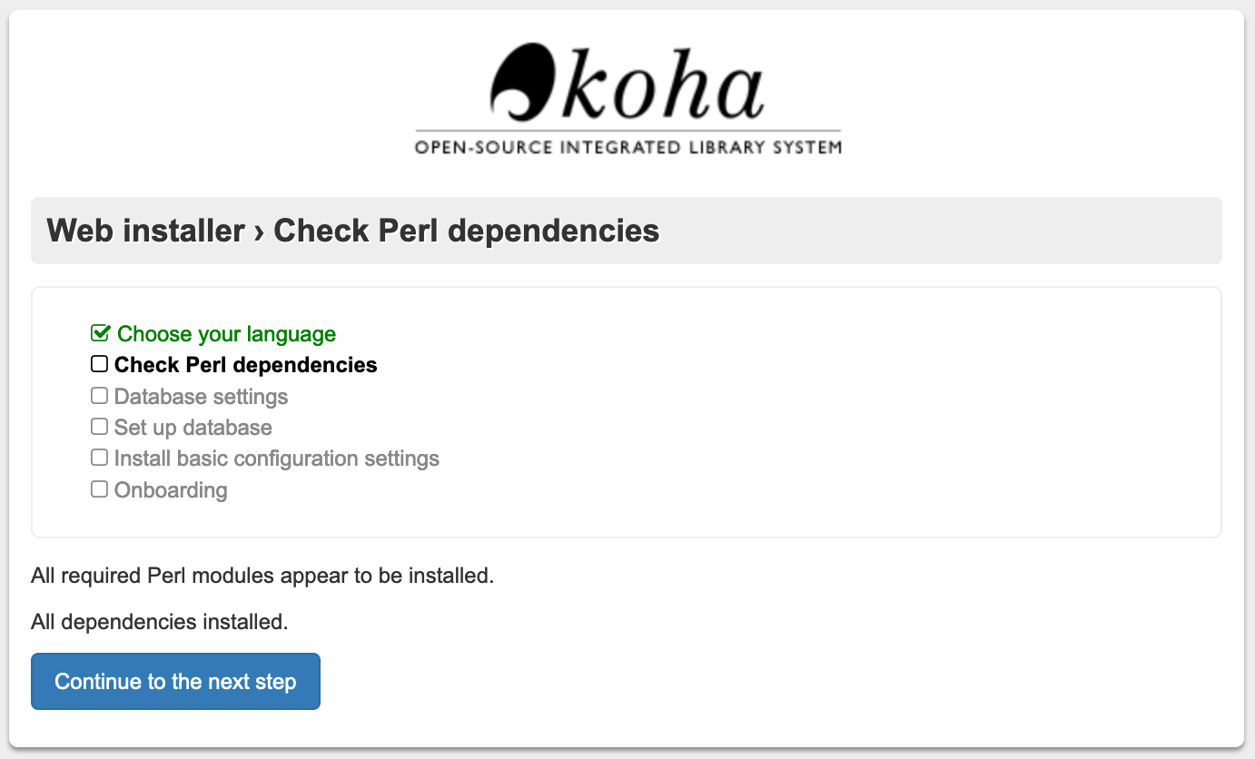 Created attachment 127036 [details] [review] Bug 27823: List upcoming steps during installation process This patch adds text to each step of the installation process showing which steps have been completed, which step is current, and which steps come next. This helps the user know where they are in the process. To test, apply the patch and begin the process of installing Koha. In my testing environment I drop the Koha database and create it again. On each step of the installation process, confirm that the list of steps is correct, showing the right stage in the process. Signed-off-by: David Nind <david@davidnind.com>