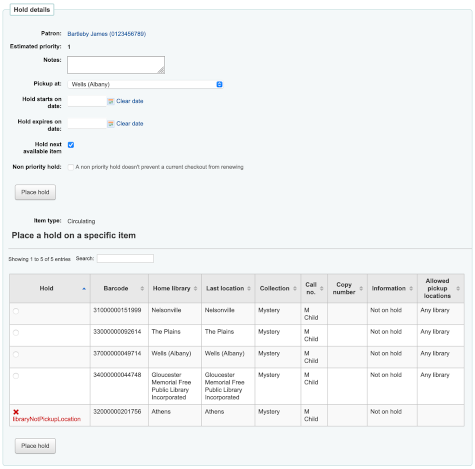 I think I am missing something in the test plan: - I am using "Fairview" for testing. - I have set Fairview to be no pickup location in libraries. - I have made sure that there are no other rules blocking a hold on the items. - In the pick-up location pull down, Fairview no longer shows up. Therefore... there is no error for any item specific hold? I am not sure what I am missing here in order to trigger the error. I think there was some recent work on pick-up locations - maybe something changed?