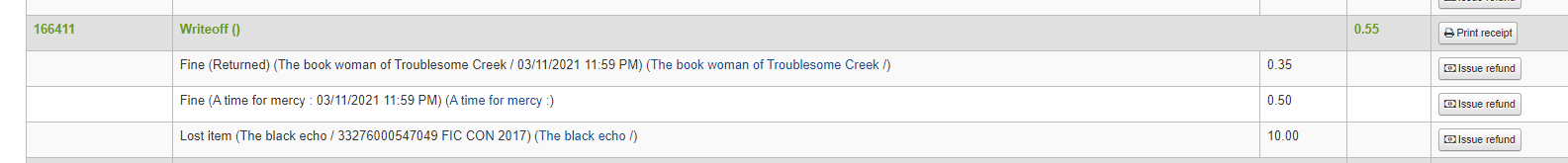 Created attachment 119061 [details] Write off error Looking closer at my write off example, the total added to the drawer does not make sense. I've attached a screen shot. The lost item was automatically credited ($10.00) to the patron because the item was returned. The two remaining fines were written off and totaled $0.85. So where did the $0.55 come from?