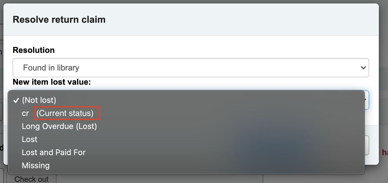 Created attachment 122047 [details] Proposed wording I've attached a screenshot of the resolution interface. The item in question is currently set to the lost status cr. When resolving the claim, I'd like to see it default to maintaining the existing value. Further, it'd be helpful to have the current value noted in this dropdown. I added some wording, which I've marked with a red box. Thanks!