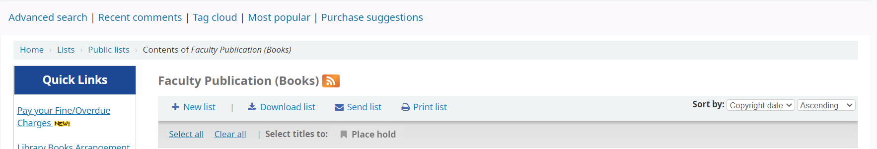 If you create a list and choose to sort by copyrightdate the list results will display on both staff interface and opac in ascending date order (oldest first). It would be useful to be able to choose ascending or descending as the default as often libraries will want the newest items to appear first.