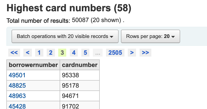 Hi Owen, I am seeing something a little odd here, can you please check? Tested on the standard sample database with a bit below 1000 items: 1) Create a new SQL report: select * from items; 2) Run the report 3) By default, 20 results show on first page. 4) Switch to 1000 5) All results show, but the pull down disappears and you can't switch the setting again.