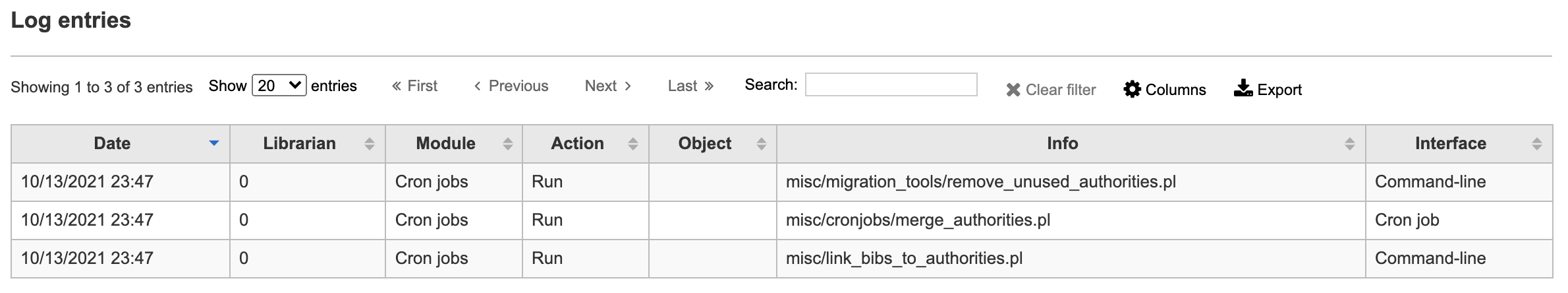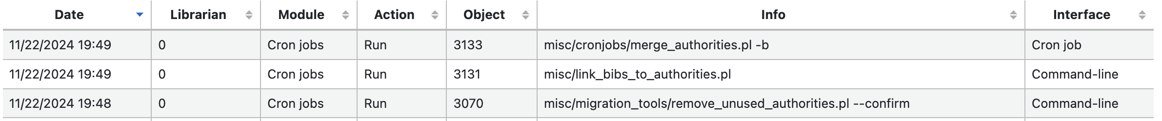After a few cron jobs related to authority records (misc/migration_tools/remove_unused_authorities.pl, misc/link_bibs_to_authorities.pl) were set up to run on our instance, I went to check the Log Viewer tool but couldn't tell that they were configured. I was told that only newer cron jobs actually appear in the logs, and on inspecting those two I saw that they lacked the call to `cronlogaction()` which our circulation-related cronjobs have. It'd be helpful to know if/when these jobs ran. I realize this is a bit debatable because those two scripts don't reside in misc/cronjobs and right now the only scripts that call `cronlogaction()` are in that directory. Is it appropriate to add that logging to these scripts? We do run them on a schedule, it's important to our authority records workflow. This is the complete list of ones I'd like to add logging to: - misc/link_bibs_to_authorities.pl - misc/cronjobs/merge_authorities.pl - misc/migration_tools/remove_unused_authorities.pl A side note: there are several scripts in misc/cronjobs, like merge_authorities.pl, that are not logged and probably should be, but that is a larger bug and I'd like to focus on these first since they're relevant to us.