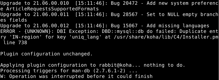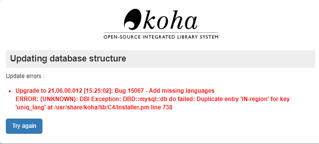 Bugzilla – Bug 29641Upgrade to 21.06.00.012 [15:20:16]: Bug 15067 - Add missing languages ERROR: {UNKNOWN}: DBI Exception: DBD::mysql::db do failed: Duplicate entry 'IN-region' for key 'uniq_lang' at /usr/share/koha/lib/C4/Installer.pm line 738Last modified: 2021-12-12 09:24:06 UTC