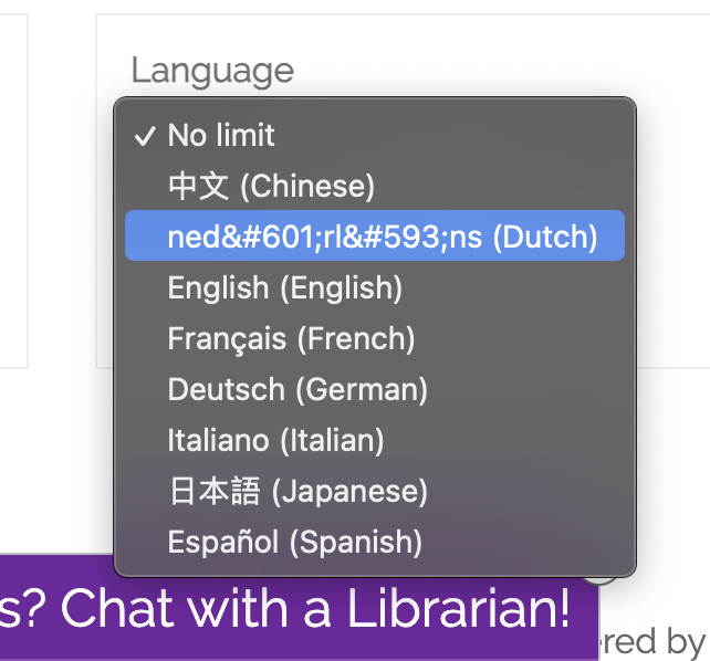 Created attachment 130998 [details] screenshot of bug To recreate: - add Dutch "dut" to the AdvancedSearchLanguages option - go to the advanced search page /cgi-bin/koha/opac-search.pl - click open the Language select menu - note that the text for Dutch is "nedərlɑns (Dutch)" It should render as "nedərlɑns (Dutch)" but instead the numerical character references for the fourth and seventh characters are rendered literally, as if they were escaped. I haven't looked into this further so I don't know _why_ this is happening but Koha's OPAC uses charset=utf-8 so I think we should be able to simply use the actual characters without any references. Perhaps it's a problem with the encoding of strings in the database? But when I run a report to pull all the rows from the `language_descriptions` table, the word "nedərlɑns" renders correctly.