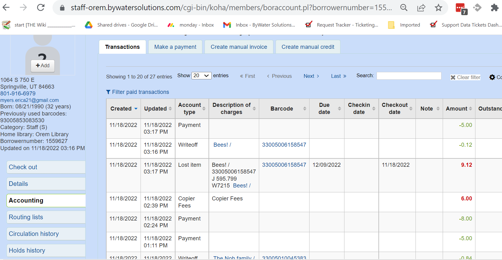 Created attachment 144183 [details] Title and Barcode don't show on on the transaction history or on the details I think this is a dual problem. In my opinion, the title of the item paid should be on both the overview of the accounting transaction and ALSO on the detail screen. As you'll see in this new attachment, there is also no title or barcode if you go to see further details. Why does it show the title and barcode when a write off happens, but not when a payment is made? That makes no sense at all, to me. I can only imagine that this is a recent problem and it hasn't always been this way.