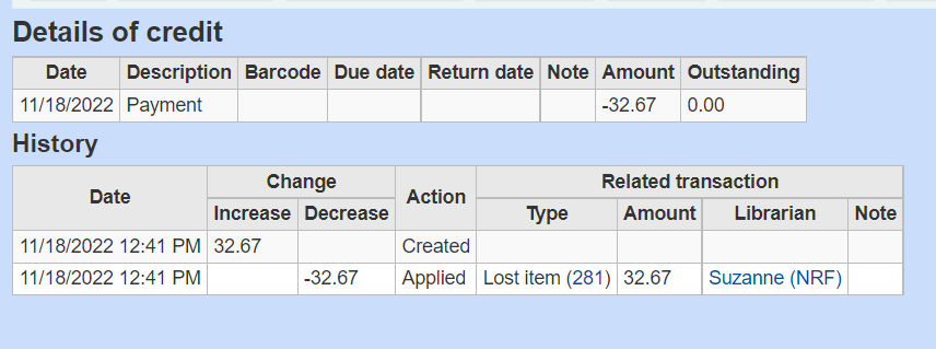 I am very surprised this hasn't been corrected already. I wonder if it just recently happened, as it is a real problem. When patrons pay for an item (fine or lost item), any write off gives the details on the item that had a write off, but a payment shows nothing at all about what item was paid for. Please escalate this as soon as possible. Thank you!