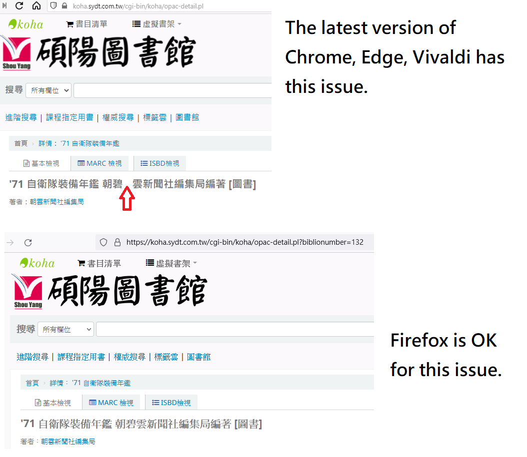 謝謝 Frank. Great to hear from you. Very much appreciate your work on translating Koha into Chinese. I've taken a look at biblionumber 132 on the Koha from your screenshot, but I can't replicate the problem on the latest Chrome on Windows 10. In the screenshot, the problem looks like it's concerning this line of HTML: <span class="title_resp_stmt">朝碧雲新聞社編集局編著</span> On my system, those 11 Chinese glyphs are rendered using the Microsoft YaHei font, and there's no space there. -- I'm just noticing that you reported this back in March, so I'm guessing that you must have resolved your issue. I was going to say that it's a strange place for there to be a space regardless of font. I would've guessed a data error rather than a font error there. I've recently been doing more work on Koha in Traditional Chinese, so your issue caught my eye.