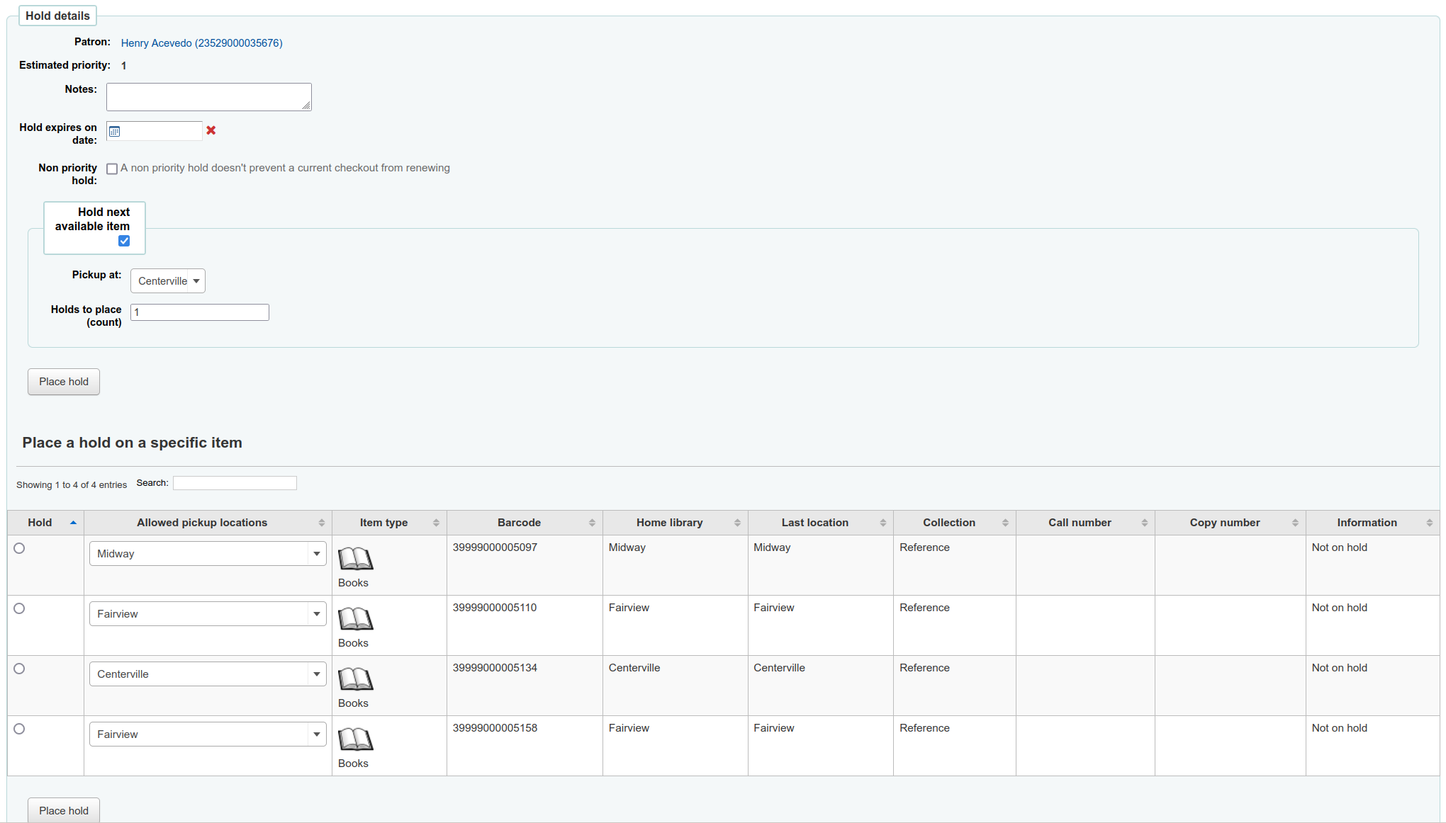 I really like the redesign - it's very clear and user friendly. It all works perfectly, except if the staff make a mistake and do the following: - Place a hold for a patron - Choose 'Place a hold on a specific item' - Fail to choose an item - Just press the 'Place hold' button beneath 'Place a hold on a specific item' (#hold_item_btn) The hold is now placed for pick up at a blank library. If you check an item in to fill the hold, Koha presents an error page, e.g. Can't call method "branchcode" on an undefined value at /kohadevbox/koha/Koha/Item.pm line 683 On the current version of Koha, if the staff press this button (#hold_item_btn) without selecting an item, the hold defaults to being a bib level hold where the pick up library is the logged in library (as if they'd pressed: #hold_any_btn) It'd be good if the 'Place hold' button for 'Place a hold on a specific item' could be blanked out until a specific item has been chosen. Alternatively, maybe the pick up location drop down could go back into the 'Hold details' section at the top of the page - so then it can still fall back to a bib level hold if it's pressed without selection, but it would still be given a location.