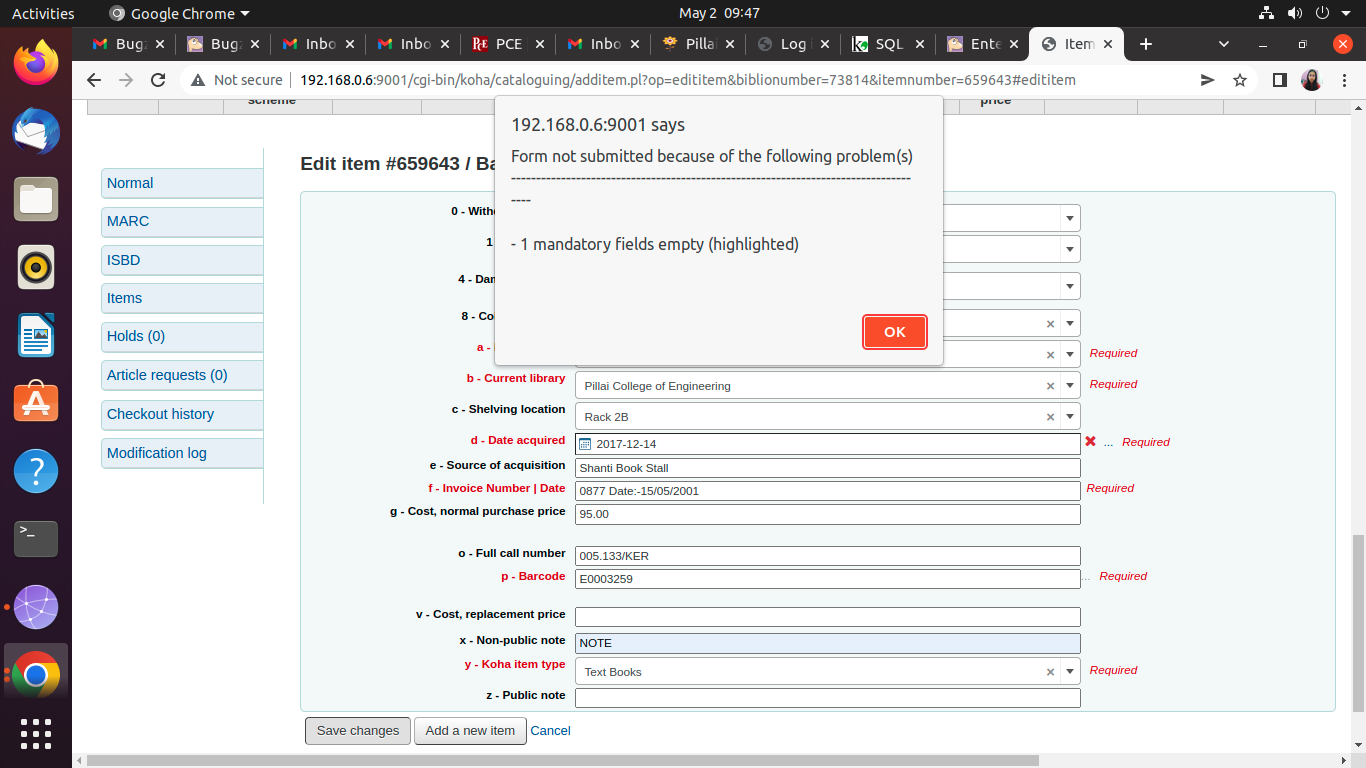 Thanks for your prompt reply. I read bug no 30361 and I am having the same problem. When I upgraded from 17 to 21.11.03 I found when adding an item using the book framework it would refuse to save the net item. It instead displayed a popup that stated a mandatory field was blank. It does not provide any visual indication as to which field is the problem. I determined that the specific field that was causing the problem had the dateaccessioned.pl plugin and is the 952$d. The date picker does generate a date which looks normal, but the item just can’t be saved. When I edited the framework to make this field not mandatory, then I can not save the framework, it gives error. I think dateaccessioned.pl plugin throws the error. Recently I have deleted the subfield 952$d, now it works fine. But it's a very important field for generating reports and keep tracks of books, we can not ignore this field.