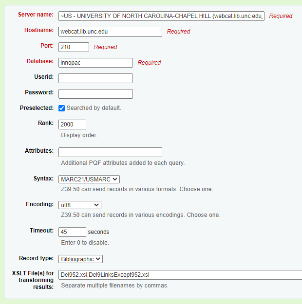 Created attachment 135974 [details] koha intranet error I wonder how may one debug errors 500 in z3950_search.pl, especially when searching against multiple targets. Searching for ISSN 1061-2688 in the following targets (among many others) host: webcat.lib.unc.edu port: 210 DB: innopac host: afton.lib.unc.edu port: 210 DB: INNOPAC I get the following error: Home Error 500 An error has occurred! Error 500 This message may have been caused by any of the following reasons: You made use of an external link to an item that is no longer available You followed an outdated link e.g. from a search engine or a bookmark You tried to access a page that needs authentication An internal link in the client is broken and the page does not exist What's next? Use top menu bar to navigate to another part of Koha. To report a broken link or any other issue, please contact the Koha administrator. Send email Error logs to be uploaded. Please don't focus on the server mentioned in them, as I located the servers above in previous tries but decided to file a bug report on subsequent searches that produced said error. In different previous searches I've encountered the same problem while searching against targets host: NLS.ALMA.EXLIBRISGROUP.COM port: 210 DB: 44NLS_INST (https://www.nls.uk/catalogues/z39-50/) host: ELIBRARY.MEL.ORG port: 210 DB: INNOPAC for example. Again, these are merely the targets I had managed to narrow down in the past. I noticed that tag 915 is mentioned in the logs (...Field 915 must have at least one subfield...), whereas no such tag is defined in standard koha frameworks such as BKS and SER. Could this be the culprit, data that koha doesn't expect to receive? Those very targets work fine when queried for different books/magazines, so it must be something contained in specific results. The error may also have to do with the fact that all Z39.50 servers defined in my installation have "Del952.xsl,Del9LinksExcept952.xsl" in the "XSLT File(s) for transforming results" field. Both XSLT files are stock, as provided in a packages installation. Some 10 years ago I had made the same question, but got nowhere. https://lists.katipo.co.nz/public/koha/2012-August/033847.html