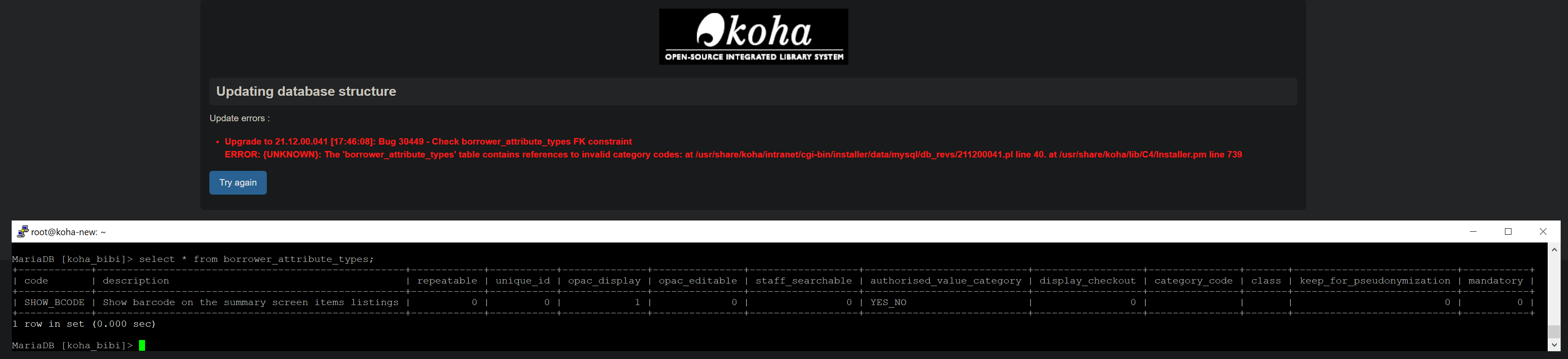 Created attachment 136483 [details] webinterface and putty screenshot While updating getting the error Upgrade to 21.12.00.041 [17:46:08]: Bug 30449 - Check borrower_attribute_types FK constraint ERROR: {UNKNOWN}: The 'borrower_attribute_types' table contains references to invalid category codes: at /usr/share/koha/intranet/cgi-bin/installer/data/mysql/db_revs/211200041.pl line 40. at /usr/share/koha/lib/C4/Installer.pm line 739 result from borrower_attribute_types; see in the attachments no other patron attributes present besides show_bcode