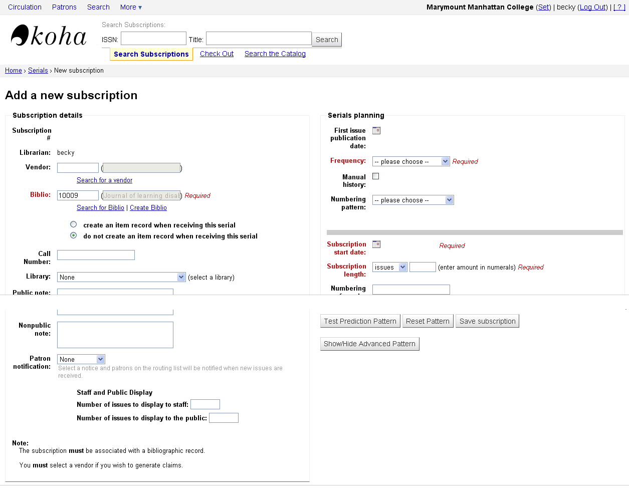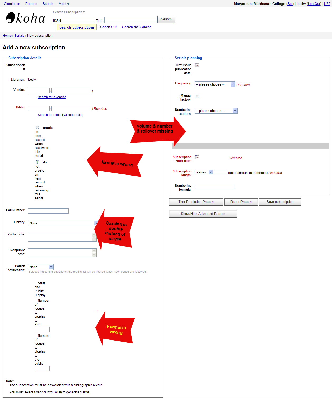 ---- Reported by gmcharlt@gmail.com 2009-04-15 17:33:14 ---- Created an attachment screenshot showing errors in subscription form using IE7 User cannot add subscription to a bib if using Internet Explorer 7 as the user agent: "I could never get a record added in IE7 because the numbering box for volume, number and rollover wouldn’t display. I didn’t test the radio buttons to see if I could select either one but can if you’d like. " Screenshot attached to this bug highlights the problem, as well as two display issues: [1] captions of some radio buttons and form inputs are compressed horizontally and stretched out vertically. [2] Excessive vertical spacing between form inputs. ---- Additional Comments From gmcharlt@gmail.com 2009-04-15 17:34:15 ---- Created an attachment for comparison, how subscription form displays in FF3 ---- Additional Comments From joe.atzberger@liblime.com 2009-04-22 20:24:24 ---- Volume info displays when pattern is selected. Sending a patch for the functionality bug, including documentation for failed attempt at fixing label display. Class "widelabel" added to relevant labels. Both (very high priority) CSS and jquery setting of width do not "take" in IE7. The background-color, however, can be affected. Go figure. ---- Additional Comments From daniel.sweeney@liblime.com 2009-04-22 21:45:49 ---- After applying the patch, the "create an item record when receiving this serial," "do not create an item recodr when receiving this serial", "Staff and Public Display", "Number of Issues to display to Staff," and "Number of issues to display to the public" labels are all still too narrow. I did ctrl-f5 to force a complete refresh. The problem where the numbering patterns were not appearing is fixed by the patch. ---- Additional Comments From gmcharlt@gmail.com 2009-04-23 17:07:39 ---- Pushed patch as it resolves the functionality problem. Leaving bug open for the label display problem. ---- Additional Comments From joe.atzberger@liblime.com 2009-04-24 16:22:46 ---- Split off separate ticket for display issues. Closing this one. --- Bug imported by chris@bigballofwax.co.nz 2010-05-21 01:06 UTC --- This bug was previously known as _bug_ 3118 at http://bugs.koha.org/cgi-bin/bugzilla3/show_bug.cgi?id=3118 Imported an attachment (id=1112) Imported an attachment (id=1113) Actual time not defined. Setting to 0.0 The original assignee of this bug does not have an account here. Reassigning to the default assignee for the component, gmcharlt@gmail.com. Previous assignee was joe.atzberger@liblime.com. CC member daniel.sweeney@liblime.com does not have an account here The original submitter of attachment 1112 [details] is unknown. Reassigning to the person who moved it here: chris@bigballofwax.co.nz. The original submitter of attachment 1113 [details] is unknown. Reassigning to the person who moved it here: chris@bigballofwax.co.nz.