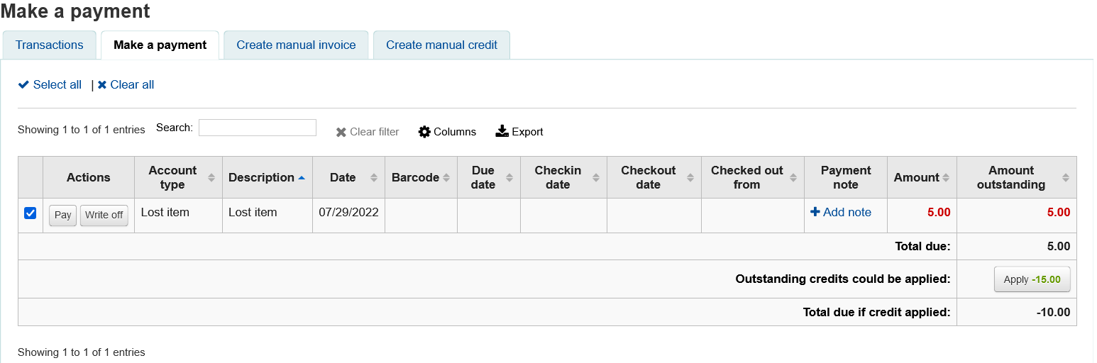 This enhancement adds the possibility to create additional fields for debits and credits. The fields can be added through the administration module. Debit additional fields appear when creating manual invoices in a patron's account, while credit additional fields appear when paying or writing off charges, or creating manual credits in a patron's account.