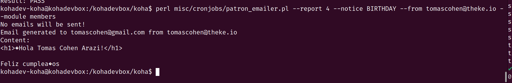 Testing notes (using koha-testing-docker): - I couldn't get step 1 to work for me, so I ended up: . Creating a new report: SELECT borrowernumber, firstname, surname, address, email, address2, city, zipcode, dateofbirth FROM borrowers WHERE MONTH(dateofbirth) = 08 . Edited details of patrons in the results so that they have an email address. . Created a notice with a code called BIRTHDAY and added some text to the Email notice with non-ASCII characters. ==> step 3 worked as expected