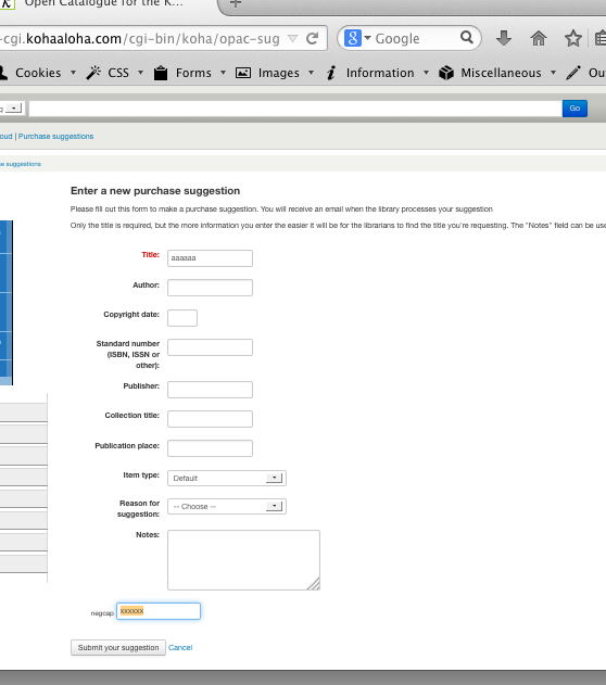 Created attachment 28508 [details] suggestions form, with hidden 'negcap' field showing