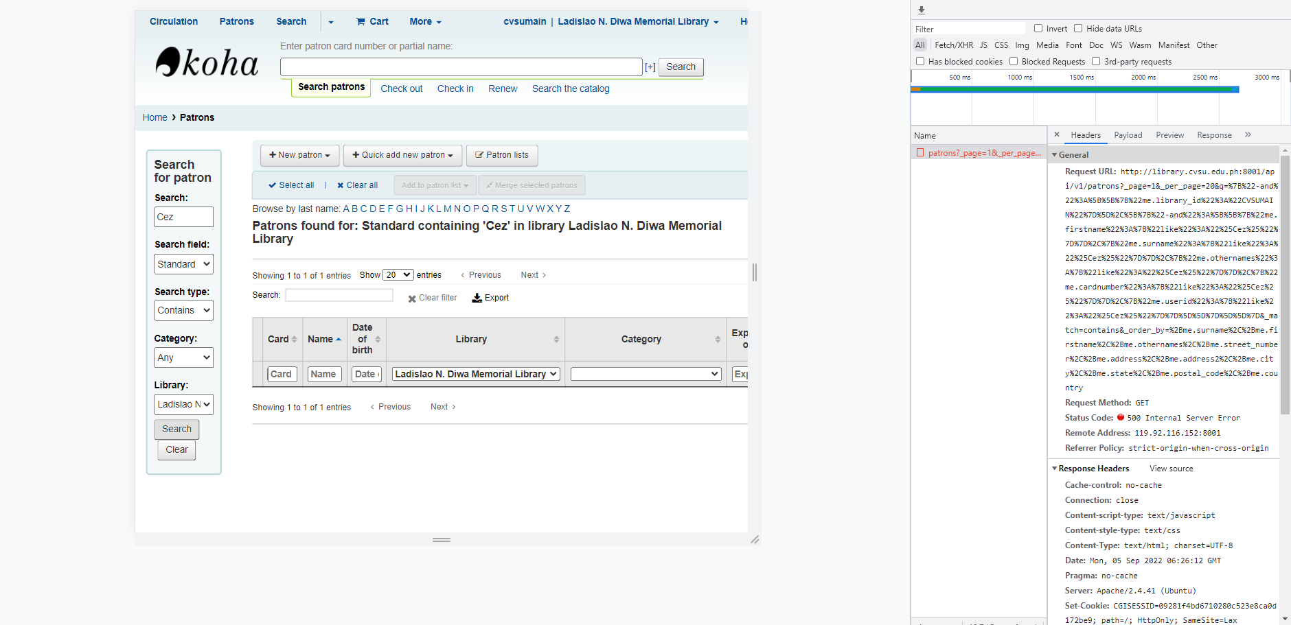 This is what I found at the plack-error.log Error while loading /etc/koha/plack.psgi: Can't load application from file "/usr/share/koha/api/v1/app.pl": Can't locate JSON/Validator/Schema/OpenAPIv2.pm in @INC (you may need to install the JSON::Validator::Schema::OpenAPIv2 module) (@INC contains: /usr/share/koha/lib /usr/share/koha/installer /usr/share/koha/lib/installer /etc/perl /usr/local/lib/x86_64-linux-gnu/perl/5.30.0 /usr/local/share/perl/5.30.0 /usr/lib/x86_64-linux-gnu/perl5/5.30 /usr/share/perl5 /usr/lib/x86_64-linux-gnu/perl/5.30 /usr/share/perl/5.30 /usr/local/lib/site_perl /usr/lib/x86_64-linux-gnu/perl-base /var/lib/koha/cvsumain/plugins) at /usr/share/koha/lib/Koha/REST/V1.pm line 25.