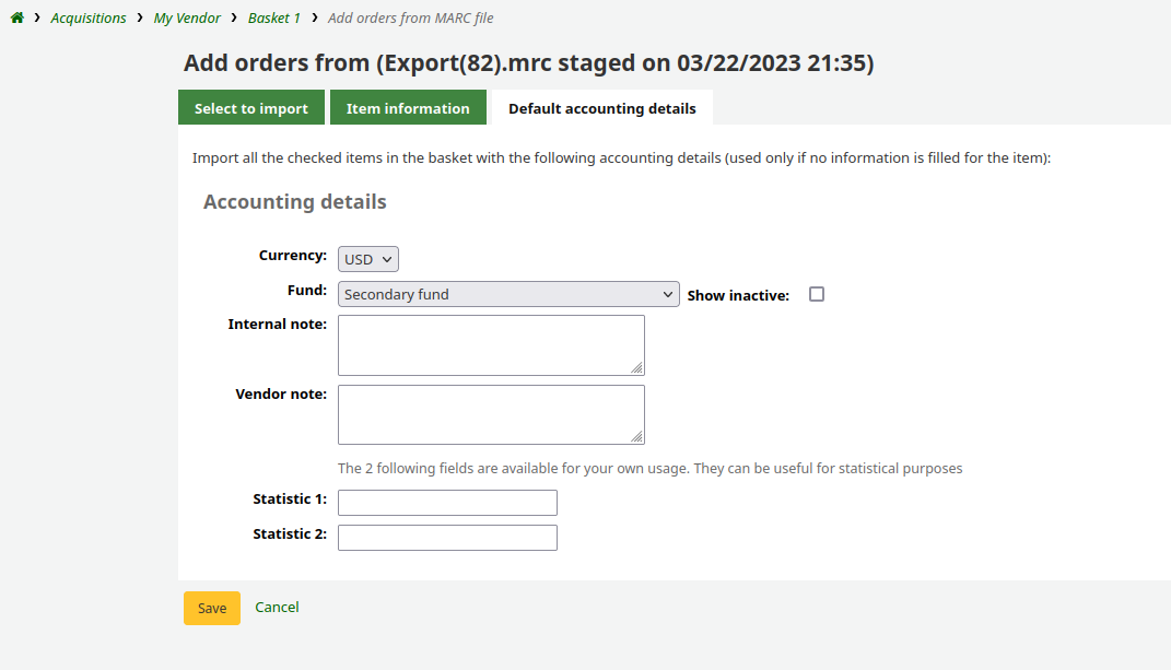 Created attachment 184121 [details] [review] Bug 31606: Add option to ignore the incoming fund on newly staged files This enhancement adds the option to ignore the fund specified in newly staged records when adding orders to a basket. To test: 1) Configure the MarcFieldsToOrder syspref so that Koha knows to map a MARC field in the staged record to a budget. It may look something like this: budget_code: 942$e 2) Make sure you have a MARC file where your configured MARC field contains a fund code that exists in your Koha. You could follow these steps: a) Create an active budget b) Attach a fund with code FUND c) Edit a record d) If using the mapping configured in MarcFieldsToOrder above, add FUND to the 942$e of your record e) Download the record in MARCXML format 3) Go to Acquisitions. Create a vendor and a basket if you don't already have them. 4) Add an order to the basket 5) Choose 'From a new file' 6) Upload the MARCXML you just downloaded and stage for import 7) In the 'job enqueued' box, notice there is a sceond button to 'Add staged files and ignore incoming fund'. Click the normal button to Add staged files to basket 8) Open the record you just staged by clicking on it/the checkbox. Confirm the fund pre-selected is the FUND from your budget_code field i.e. 942$e. Go to the Default accounting details tab, there may or may not be a different fund selected there. 9) Click Cancel, you'll be redirected back to the basket. 10) Repeat steps 4-7, except this time, check the new second button to 'Add staged files and ignore incoming fund' 11) Repeat step 8 and confirm there is no fund pre-selected, for both the staged record and under the Default accounting details tab. 12) Click Cancel, you'll be redirected back to the basket. 13) Repeat steps 4-7, except this time, click the 'View detail of the enqueued job' link 14) Confirm both buttons are there to add staged files to basket, with or without incoming fund, and they work as expected. Sponsored-by: Friends of Round Rock Library Signed-off-by: Rhonda Kuiper <rkuiper@roundrocktexas.gov>